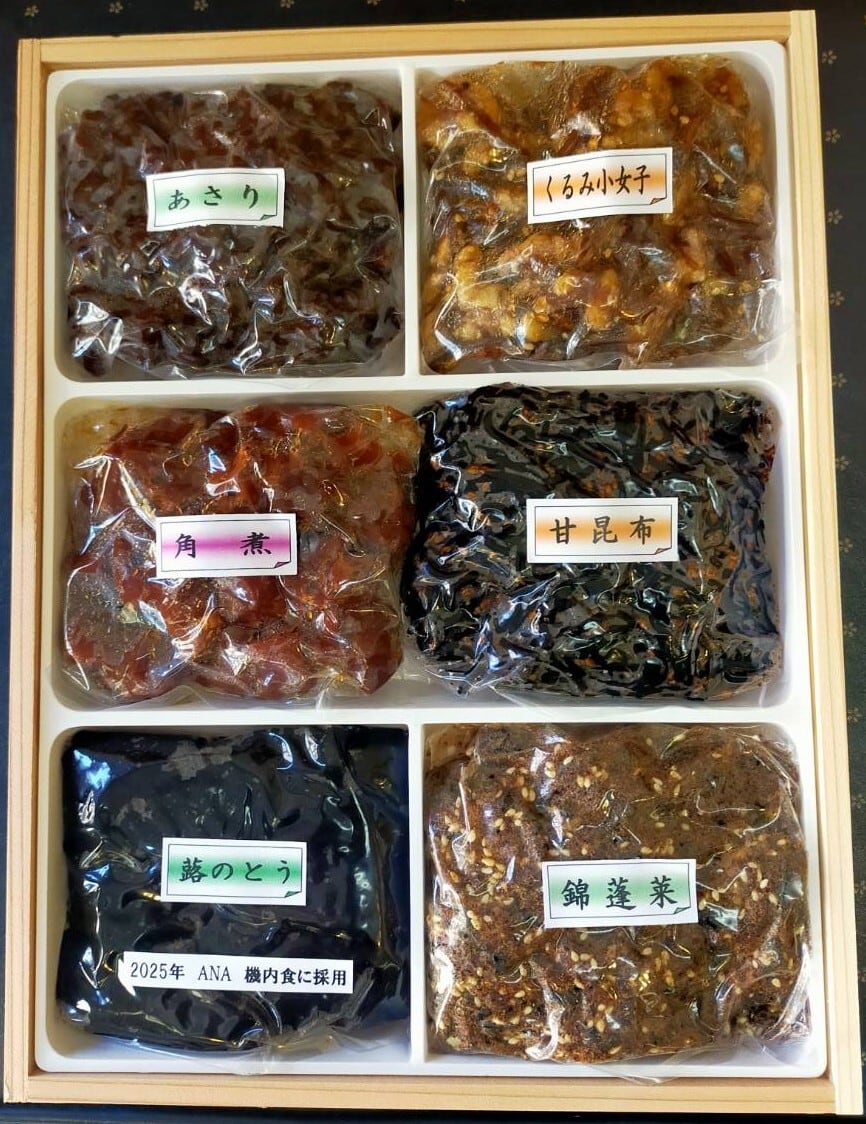 【令和7年度 船橋商工会議所 伴走型小規模事業者支援推進事業】 佃煮処「はまや」は総業約70年。 昔から変わらない製法や味を守り続けている佃煮屋です。 看板商品の蕗のとう佃煮、錦蓬莱(きんほうらい)を含む人気商品6種の詰め合わせです。 【容量】 くるみ小女子、あさり、鮪角煮、甘昆布、錦蓬莱、蕗のとう 各1袋 【消費期限】 夏季2週間 冬季3週間 【アレルギー】 小麦・大豆 【店舗情報】 船橋市本中山2-14-18