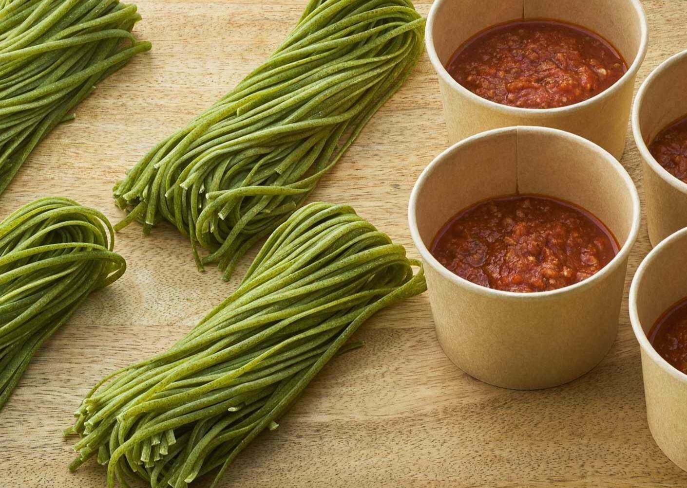 船橋出身のシェフと地元漁師/農家さんとのコラボ商品。 船橋漁港で水揚げされたコノシロのお魚ミートソースと船橋名産小松菜を練り込んだ生パスタ。全員の顔が見える船橋オリジナルの逸品です。
