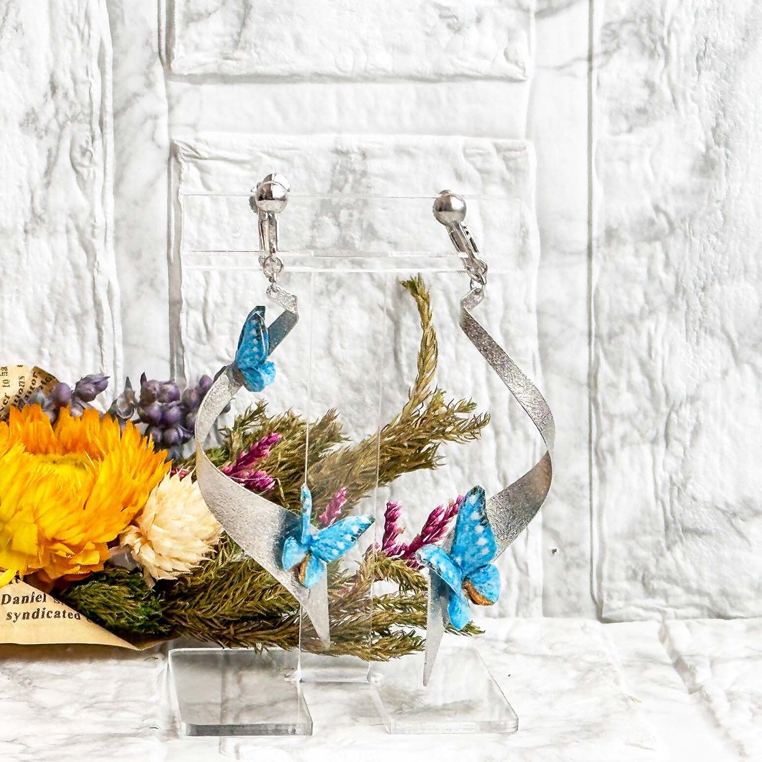このヘレナトルコブルー蝶のらせんイヤリングは、個性的で美しいデザインが特徴で、らせん状に蝶が飛んでいるように留まらせているので、揺れるたびにどこか幻想的でありながらも洗練された印象を与えます。