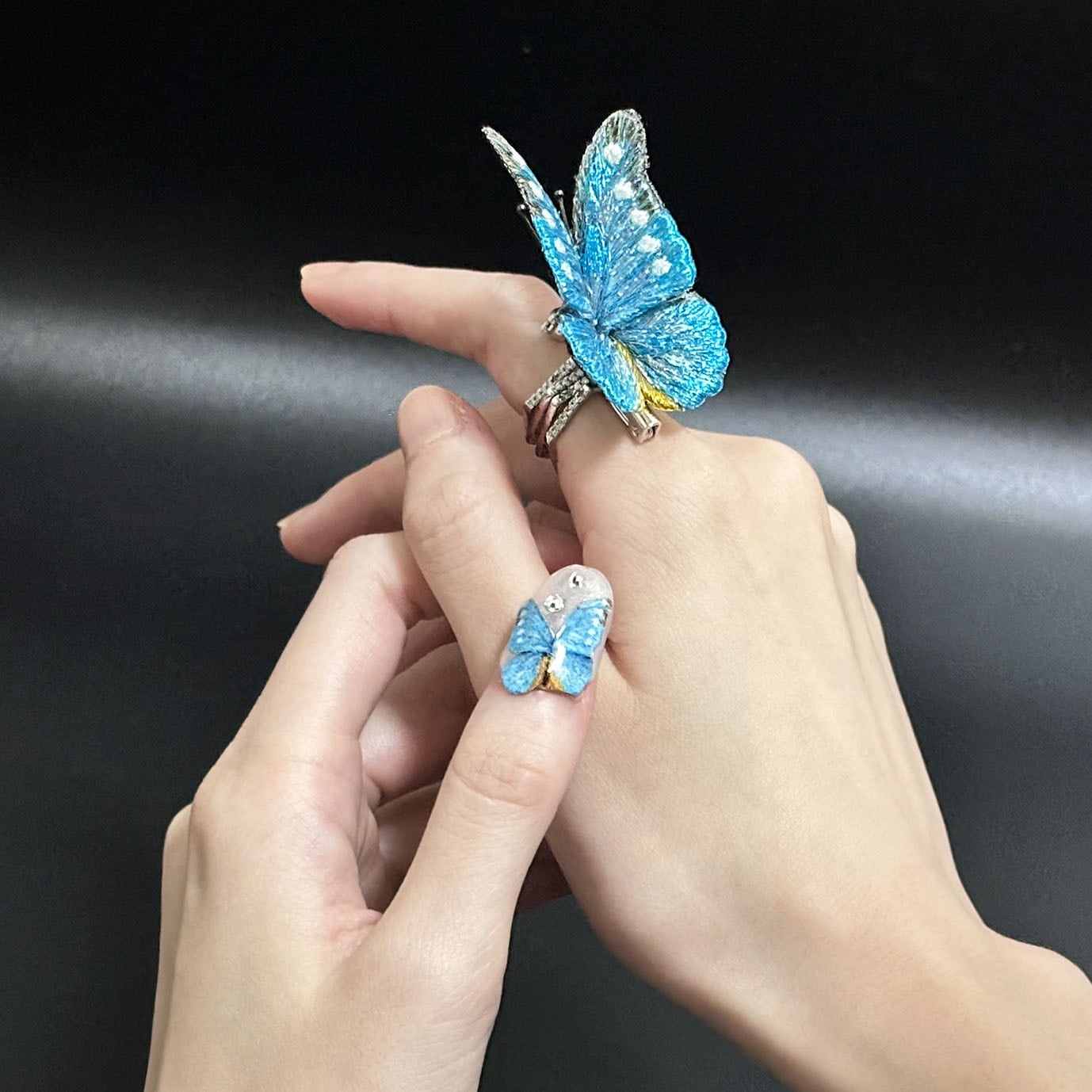 立体刺繍が織り成す青の奇跡、ヘレナトルコブルー蝶- あなたの美を一層引き立てる指輪サイズのアートジュエリー